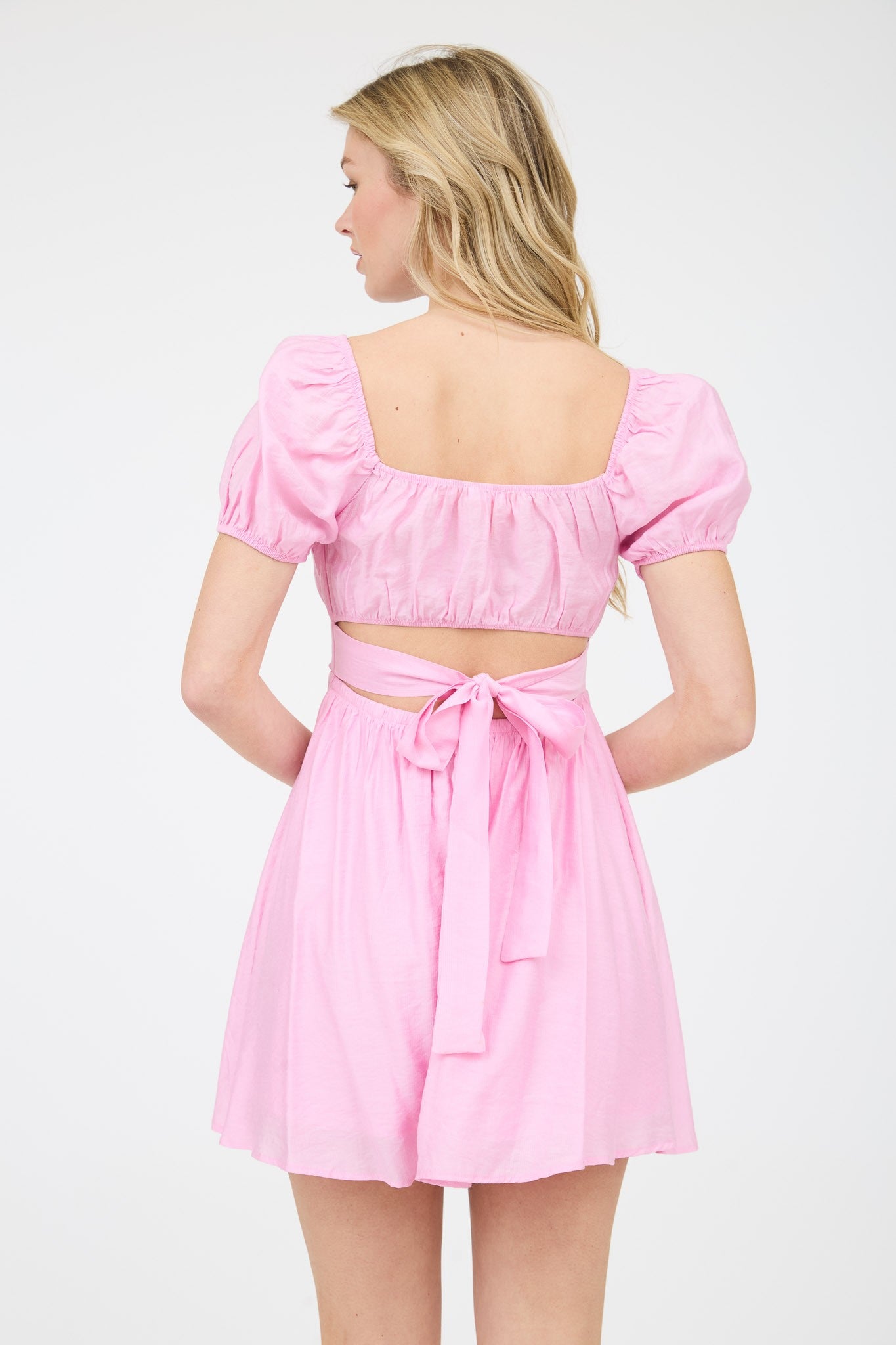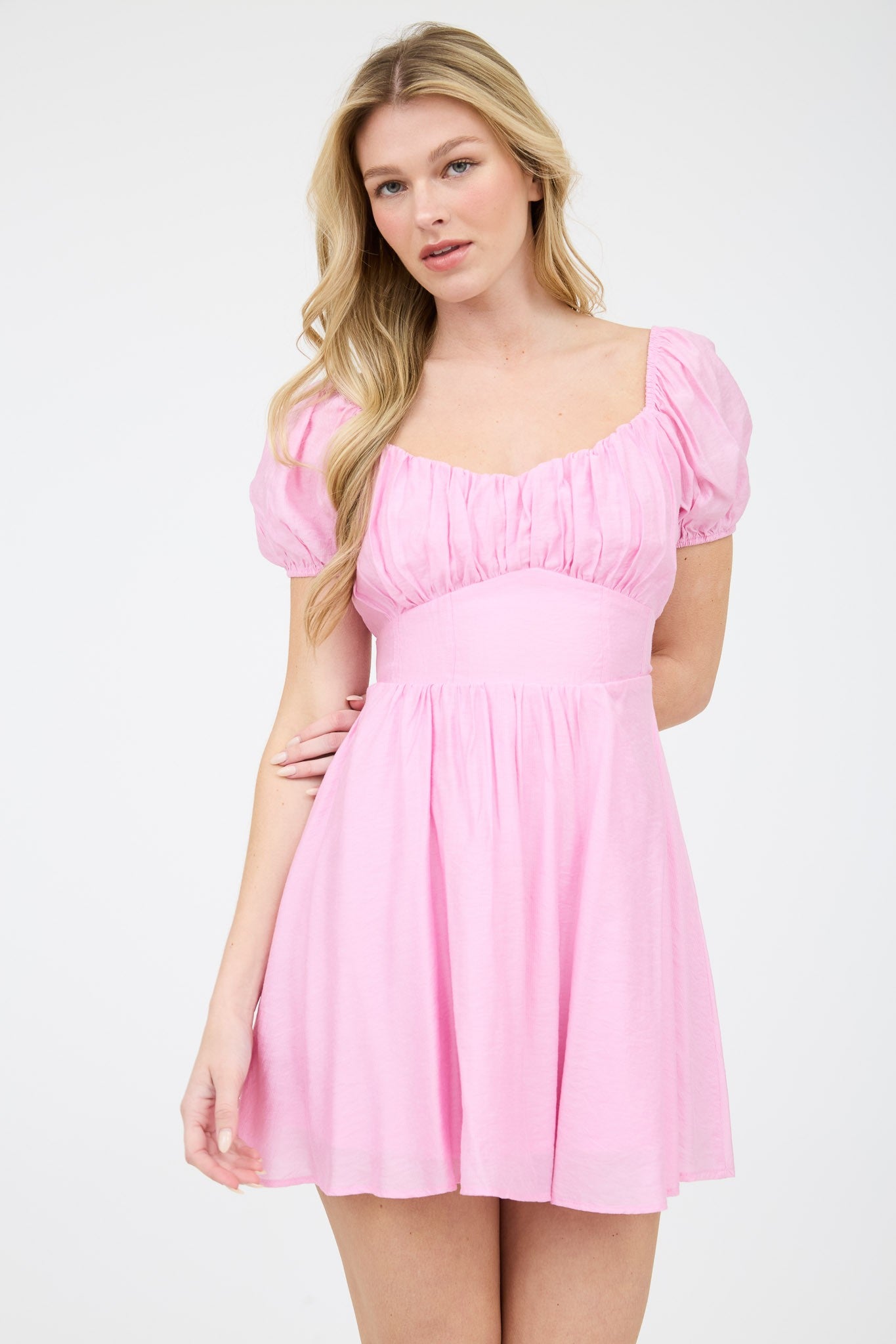 SCOOP NECKLINE SHORT PUFF SLEEVE BALLOON SLEEVE PLEATED BUST CORSET DETAIL BACK TIE DETAIL BACK CUT-OUT SOLID LINED MINI DRESS SHELL: 80%RAYON 20%NYLON LINING: 100%POLYESTER