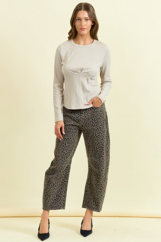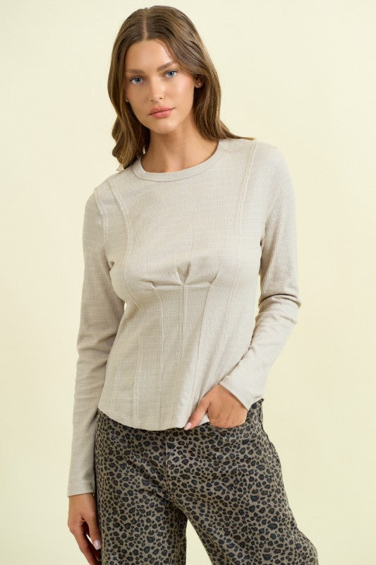 ROUND NECK LONG SLEEVE FRONT PLEAT DETAIL TOP - Round neck long sleeve top designed for versatile layering or standalone