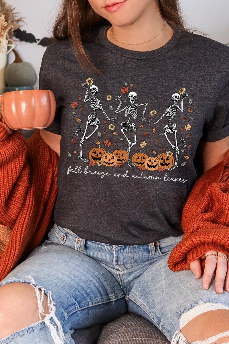 Fall Breeze and Autumn Leaves Skeleton Graphic Tee.