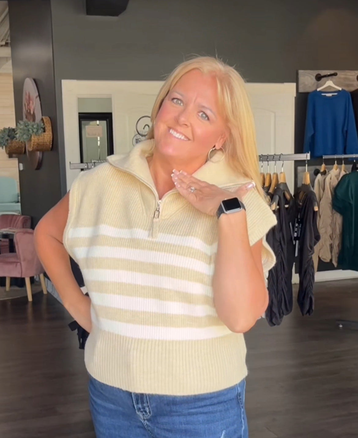 This is an adorable half zip up striped top. Perfect for all of your summer outfits