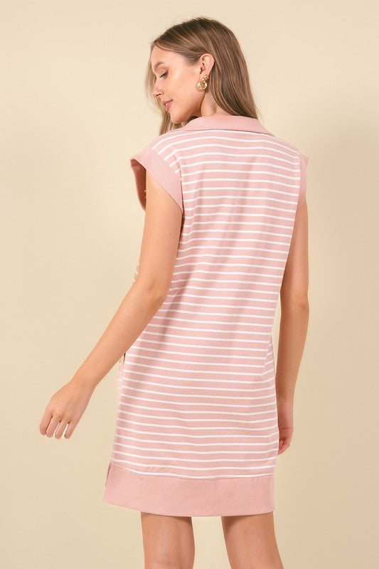 STRIPED FRENCH TERRY HALF ZIP-UP CAP SLEEVE MINI DRESS W/ SIDE POCKETS - Casual yet chic half-zip mini dress featuring classic horizontal stripe