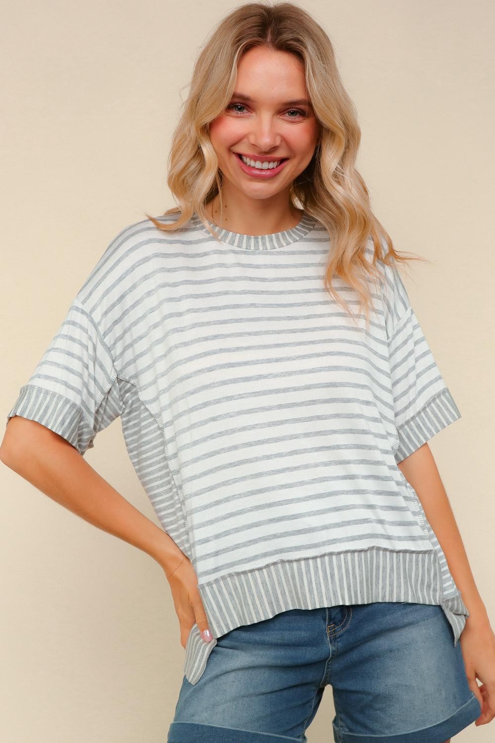 ROUND NECK SHORT SLEEVE YARN DYE STRIPE COLOR BLOCK LOOSE FIT OVERSIZED KNIT TOP WITH OUTSEAM OVERLOCK