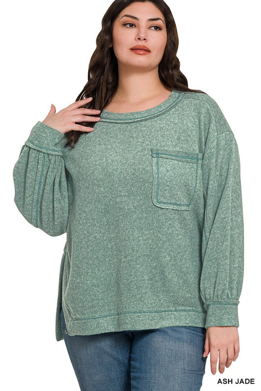 RIBBED V-NECK DROP SHOULDER TOP -BRUSHED