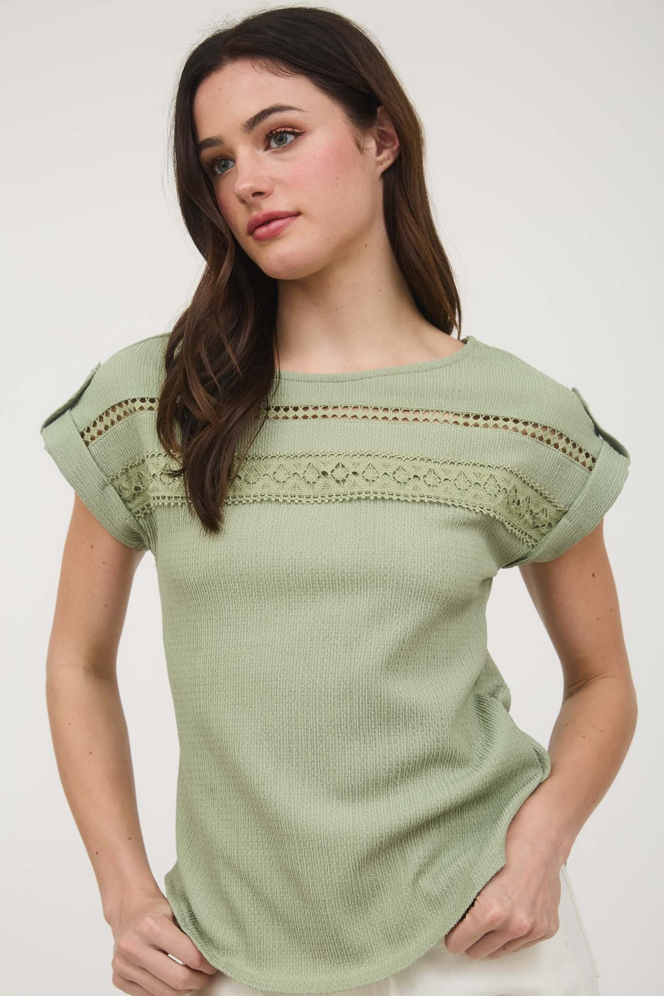 Short Tab Sleeve Lace Trim Crinkle Knit Blouse