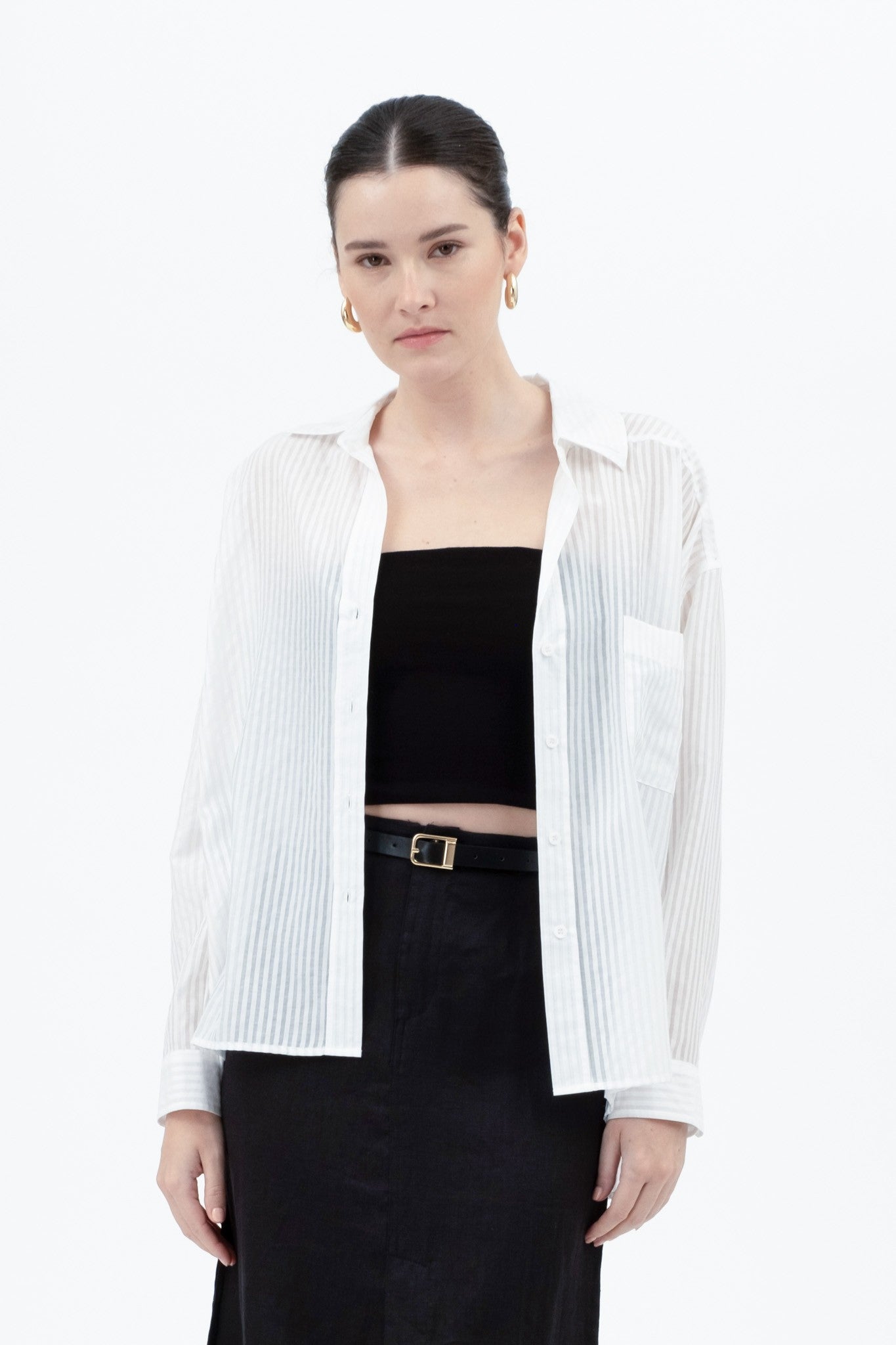 COLLARED BUTTON DOWN LONG SLEEVES EXTENDED SHOULDER OVERSIZED SHEER STRIPE PATTERN WOVEN TOP NOT LINED 75%TENCEL, 15%POLYESTER, 10%NYLON