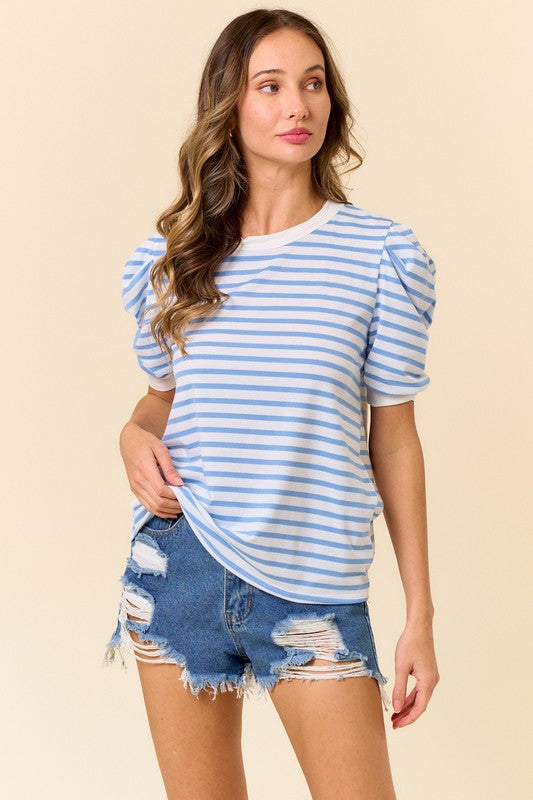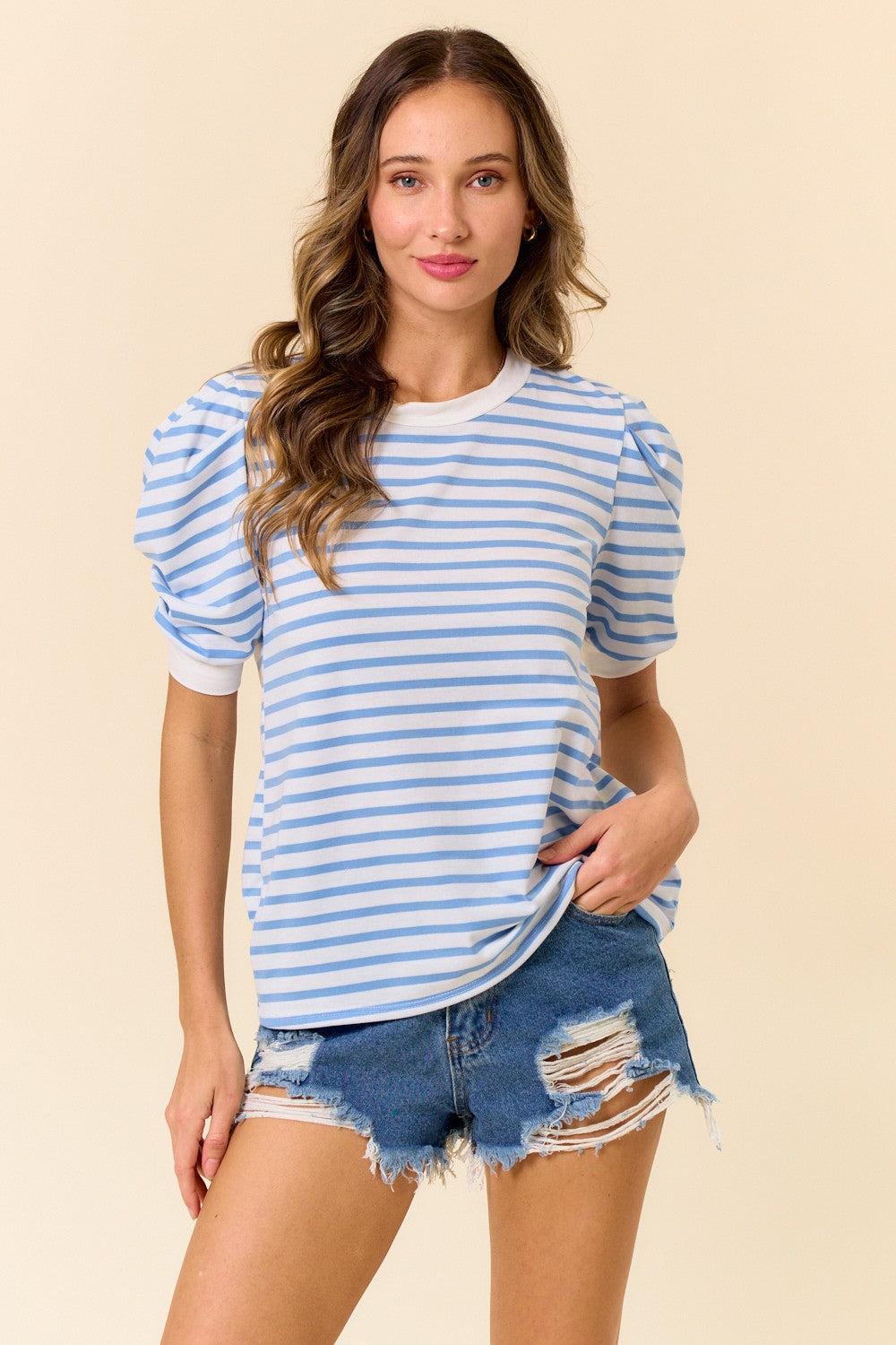Features a round neckline, puff sleeves. Has a solid neck band and
